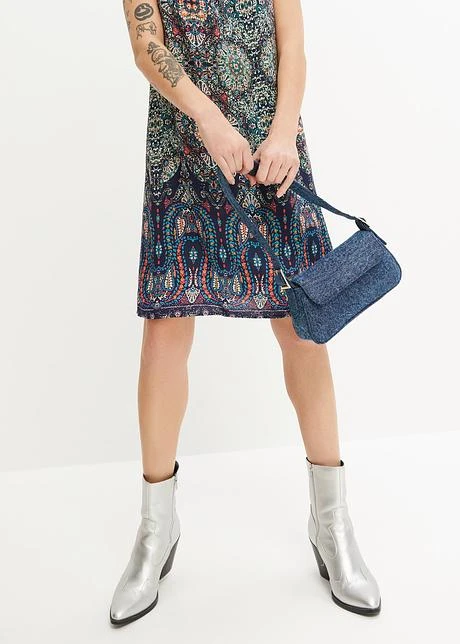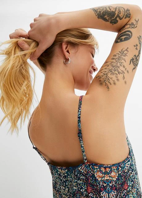 Encolure remontée, bretelles spaghetti réglables. Long. env. 98 cm.