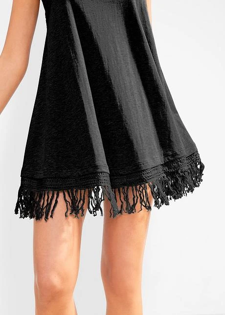 Robe de plage légèrement transparente en matière jersey agréable. Joli décolleté dos en dentelle. Base ornée de franges.