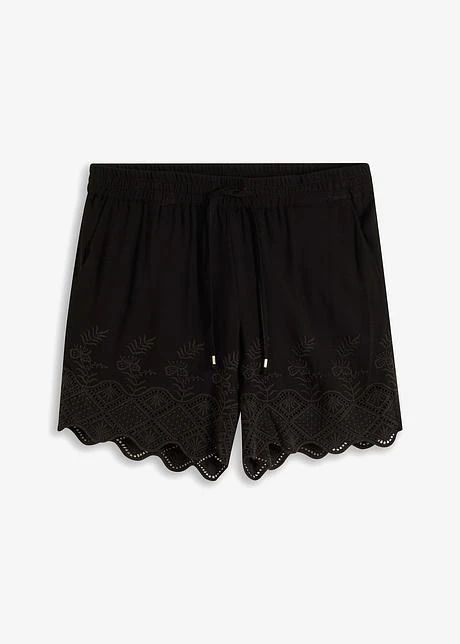 Superbe short estival avec une broderie en bas de jambes. Empiècement élastique à la taille avec lien à nouer. Avec doublure. Long. entrejambe env. 15,5 cm.