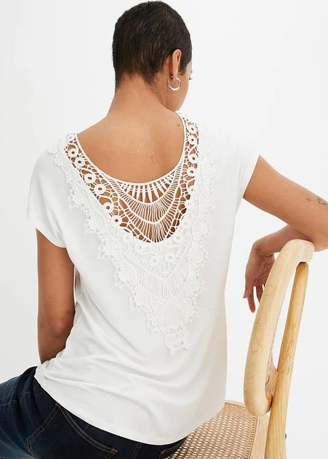 Ce T-shirt de la marque BODYFLIRT doté d’une partie dos originale est une pièce mode qui attire le regard. L’empiècement raffiné en dentelle transparente laisse entrevoir la peau et donne au T-shirt son look attractif. Il est complété d’une encolure bateau et de manches courtes. Ce T-shirt se porte avec un short en jean et des sandales dans un style décontracté pour les loisirs.